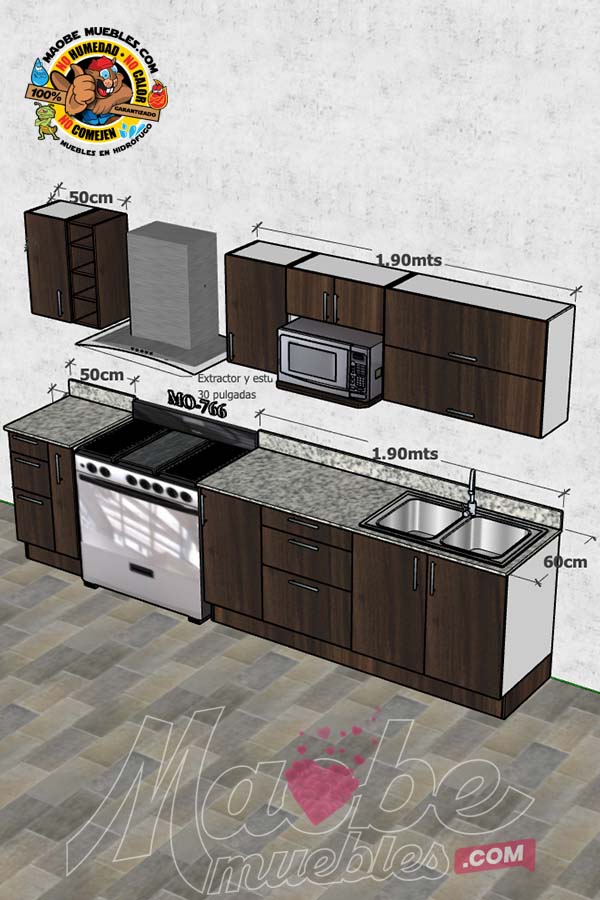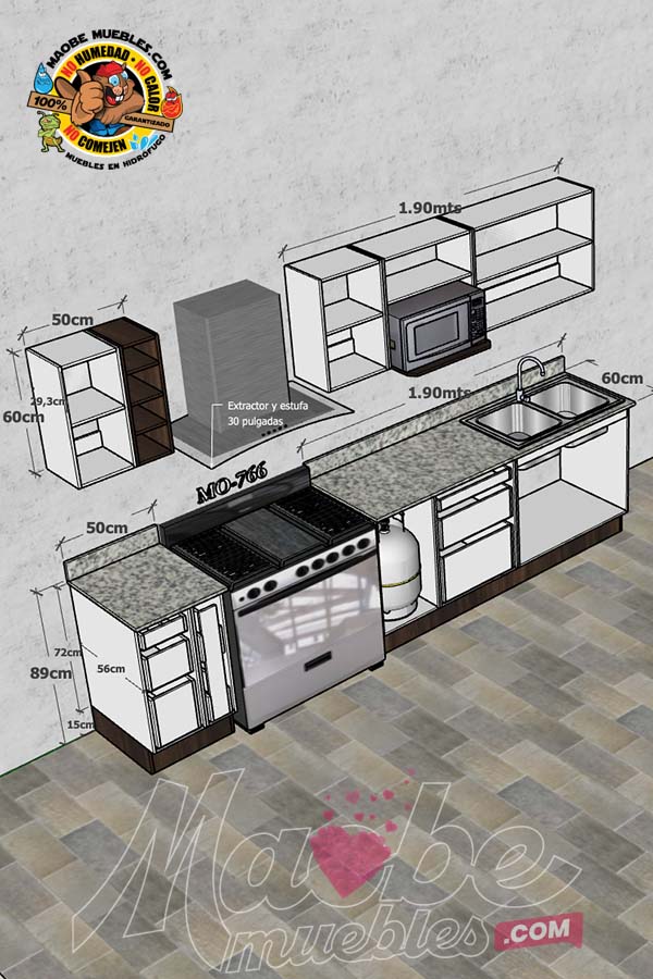 Cocina con granito 50cm + 1.90mts Aéreo, 50cm + 1.90mts Base ancho – Código MO-766